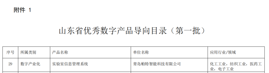 經(jīng)企業(yè)申報(bào)、各市推薦、專家評審等程序,省工業(yè)和信息化廳公布了評審結(jié)果,按照公平公正、公開透明的原則,帕特智能“實(shí)驗(yàn)室信息管理系統(tǒng)”成功入圍第一批山東省優(yōu)秀數(shù)字產(chǎn)品(方案)導(dǎo)向目錄