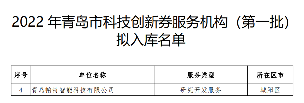 青島市科技局根據(jù)《青島市科技創(chuàng)新券管理實(shí)施細(xì)則(試行)》(青科規(guī)〔2020〕5號)和《關(guān)于發(fā)布青島市創(chuàng)新券服務(wù)機(jī)構(gòu)入庫申請指南的通知》等有關(guān)規(guī)定,經(jīng)機(jī)構(gòu)審查、材料審核,對符合科技創(chuàng)新券服務(wù)機(jī)構(gòu)申報(bào)要求的17家擬入庫機(jī)構(gòu)名單進(jìn)行了公示,青島帕特智能科技有限公司名列其中!